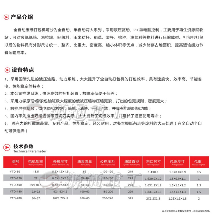 全自動廢紙打包機可分為全自動、半自動兩大系列,采用液壓驅動、PLC微電腦控制,主要用于再生資源回收站,可